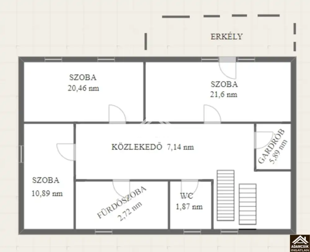 A 70 nm-es emeleten 3 szoba, gardrób, fürdőszoba, mellékhelyiség, található.