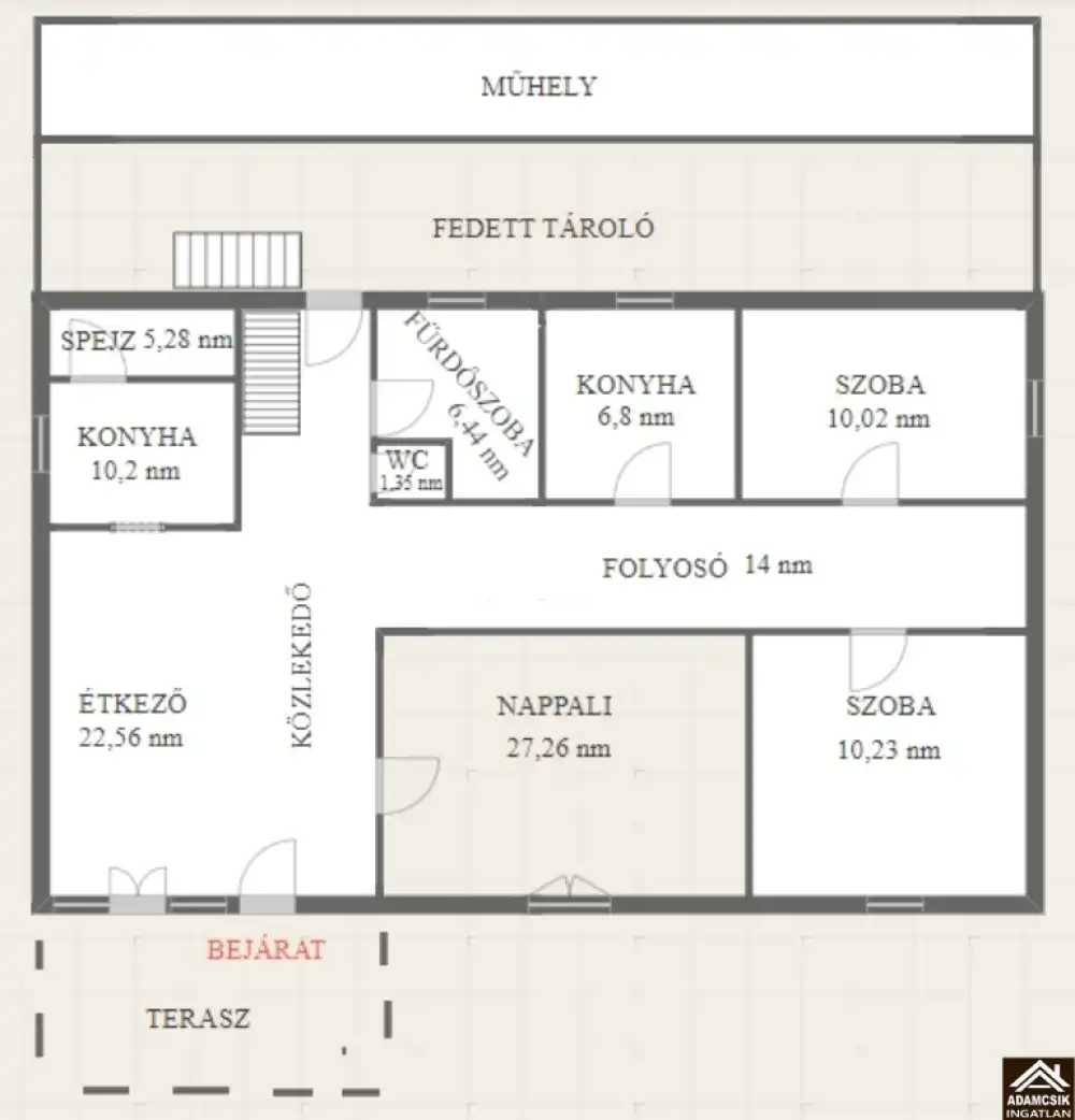 A 105 nm-es földszinten 2 szoba, 2 konyha, étkező, nappali, spejz, fürdőszoba, mellékhelyiség került kialakításra.